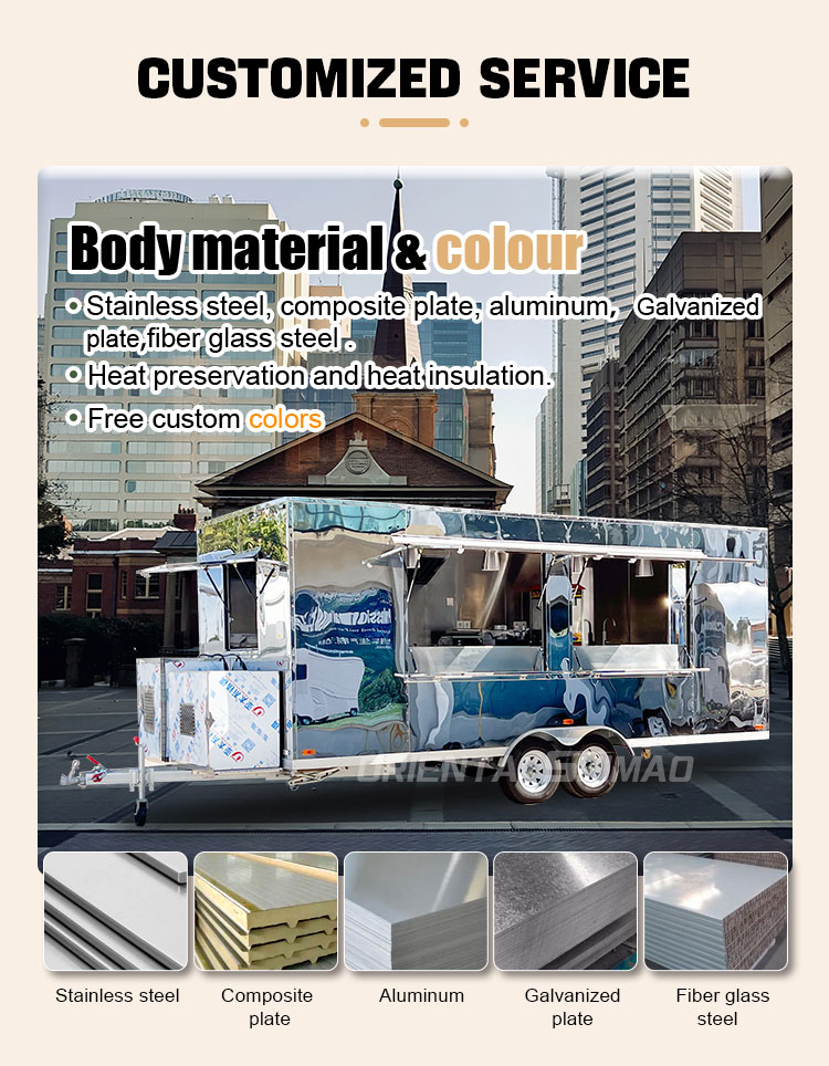 প্রধান উপাদানের জন্য, আমরা উচ্চ-মানের 304 স্টেইনলেস স্টীল বেছে নিয়েছি, যা তার চমৎকার ক্ষয় প্রতিরোধের এবং চমৎকার স্থায়িত্বের জন্য পরিচিত, এবং বিভিন্ন পরিবেশগত পরিস্থিতিতে স্থিতিশীল কর্মক্ষমতা বজায় রাখতে পারে, যাতে আমাদের ফুড ক্যারাভান পণ্যগুলি দীর্ঘমেয়াদেও তাদের চমৎকার গুণমান এবং কার্যকারিতা বজায় রাখতে পারে এবং বিভিন্ন চ্যালেঞ্জের মুখোমুখি হতে পারে। 304 স্টেইনলেস স্টিলের জারা প্রতিরোধের দুর্দান্ত প্রতিরোধ, যাতে ট্রাকটি অক্সিডেশন বা মরিচা দ্বারা প্রভাবিত হওয়া সহজ নয়, যা এর পরিষেবা জীবনকে ব্যাপকভাবে প্রসারিত করে। 304 স্টেইনলেস স্টিলের চমৎকার জারা প্রতিরোধ ক্ষমতা ট্রাকটিকে অক্সিডেশন বা মরিচারের জন্য কম সংবেদনশীল করে তোলে, তাদের পরিষেবা জীবনকে ব্যাপকভাবে প্রসারিত করে।