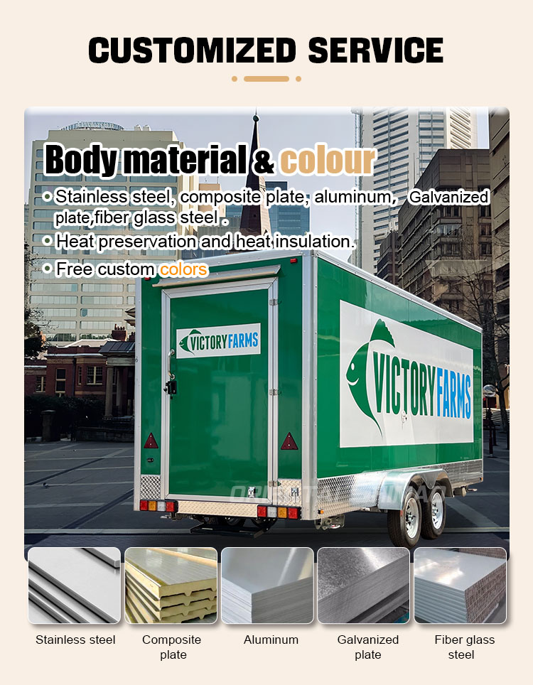 উপাদানের কাস্টমাইজেশন: উপাদানের পছন্দ সরাসরি খাদ্য ট্রাকের স্থায়িত্ব, নান্দনিকতা এবং নিরাপত্তার সাথে সম্পর্কিত। আমরা টেকসই অ্যালুমিনিয়াম অ্যালয় থেকে লাইটওয়েট কার্বন ফাইবার, ক্লাসিক স্টেইনলেস স্টীল থেকে শক্তি-সাশ্রয়ী যৌগিক উপকরণ পর্যন্ত বিস্তৃত বডি ম্যাটেরিয়াল অফার করি, যার প্রত্যেকটির নিজস্ব অনন্য সুবিধা এবং প্রয়োগের পরিস্থিতি রয়েছে। এদিকে, আমরা বিশদগুলিতেও মনোযোগ দিই, এটি চাকার উপাদান, ট্র্যাকশন ফ্রেমের দৃঢ়তা বা জ্যাকের সুবিধার হোক না কেন, আমরা খাদ্য ট্রাকের প্রতিটি অংশ সর্বোত্তম কর্মক্ষমতা অর্জন করতে পারে তা নিশ্চিত করার জন্য আপনার প্রকৃত চাহিদা অনুযায়ী এটি কাস্টমাইজ করব।