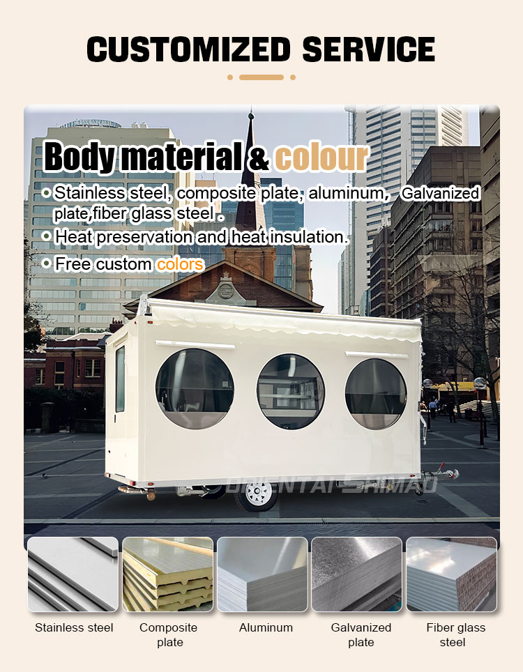 শারীরিক উপকরণ: খাদ্য ট্রাকের শরীরের স্থায়িত্ব, স্থায়িত্ব এবং নিরাপত্তা নিশ্চিত করতে উচ্চ-শক্তি, জারা-প্রতিরোধী, সহজে পরিষ্কার-পরিচ্ছন্ন, পরিবেশগতভাবে বন্ধুত্বপূর্ণ উপকরণ, যেমন স্টেইনলেস স্টীল, অ্যালুমিনিয়াম খাদ ইত্যাদি বেছে নিন।
