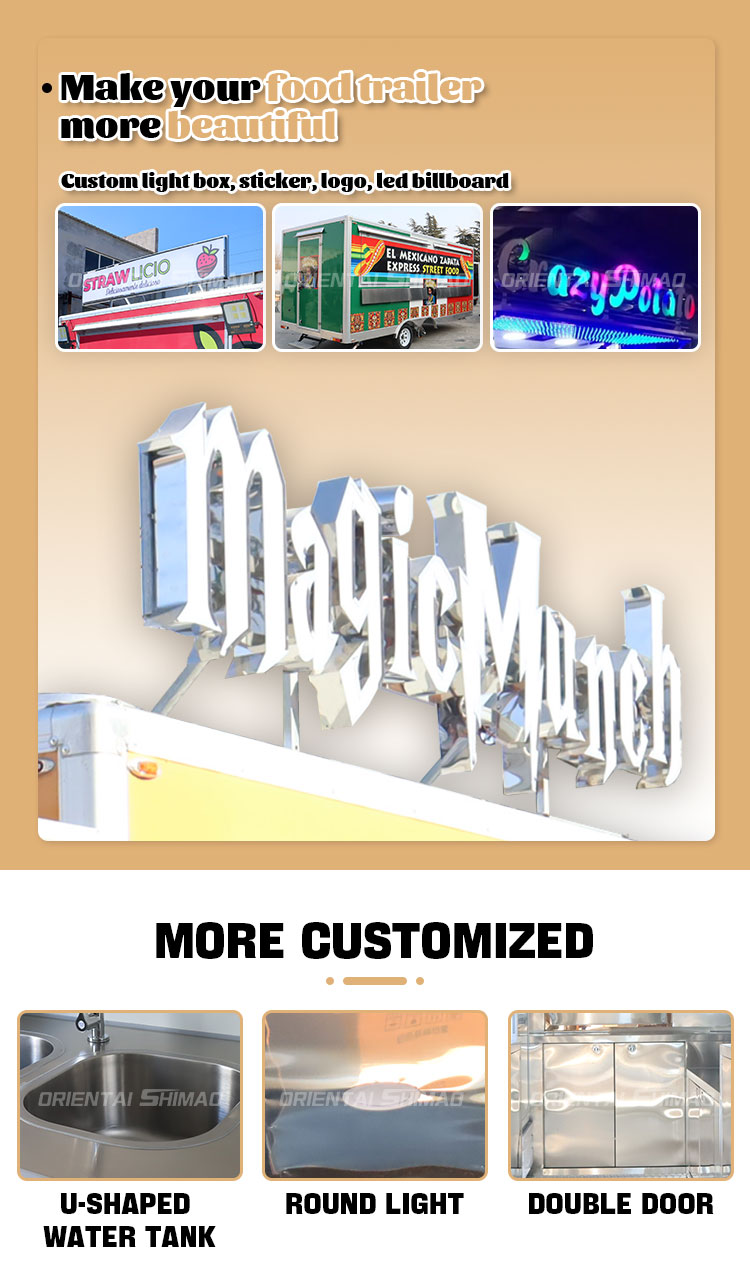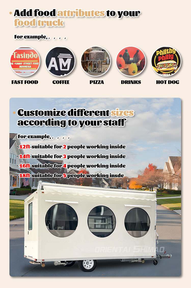 মডেলিং এবং শৈলী: খাদ্য ট্রাকের চেহারা মডেলিং এবং শৈলী গ্রাহকদের আকৃষ্ট করার জন্য একটি গুরুত্বপূর্ণ কারণ। এটি গ্রাহকদের ব্র্যান্ড ইমেজ, ব্যবসার বৈশিষ্ট্য বা ব্যক্তিগত পছন্দ অনুযায়ী কাস্টমাইজ করা যেতে পারে, যেমন সুবিন্যস্ত নকশা, বিপরীতমুখী শৈলী, আধুনিক সরলতা এবং তাই।