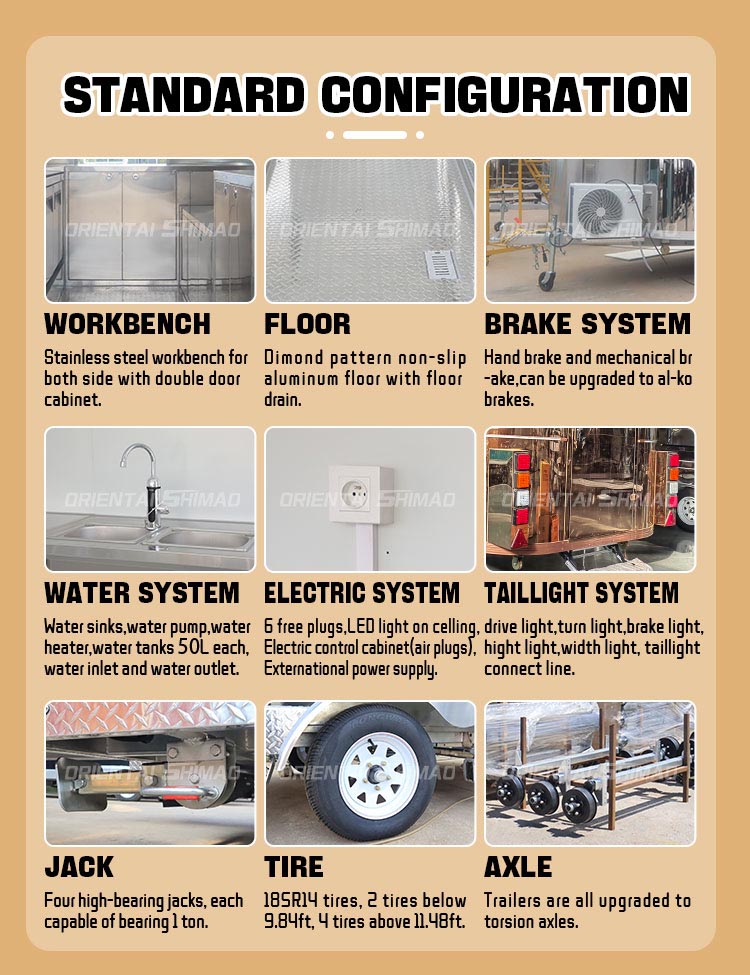 মূল উপাদানের জন্য, আমরা উচ্চ-মানের 304 স্টেইনলেস স্টীল বেছে নিয়েছি, যা তার চমৎকার ক্ষয় প্রতিরোধের এবং চমৎকার স্থায়িত্বের জন্য পরিচিত এবং বিভিন্ন পরিবেশগত পরিস্থিতিতে স্থিতিশীল কর্মক্ষমতা বজায় রাখতে পারে, এটি নিশ্চিত করে যে আমাদের Taco Concession Food Truck পণ্য দীর্ঘমেয়াদেও তাদের চমৎকার গুণমান এবং কার্যকারিতা বজায় রাখতে পারে এবং বিভিন্ন ধরনের চ্যালেঞ্জের মুখোমুখি হতে পারে। 304 স্টেইনলেস স্টিলের জারা প্রতিরোধের দুর্দান্ত প্রতিরোধ, যাতে ট্রাকটি অক্সিডেশন বা মরিচা দ্বারা প্রভাবিত হওয়া সহজ নয়, যা এর পরিষেবা জীবনকে ব্যাপকভাবে প্রসারিত করে। 304 স্টেইনলেস স্টিলের চমৎকার জারা প্রতিরোধ ক্ষমতা ট্রাকটিকে অক্সিডেশন বা মরিচারের জন্য কম সংবেদনশীল করে তোলে, তাদের পরিষেবা জীবনকে ব্যাপকভাবে প্রসারিত করে।