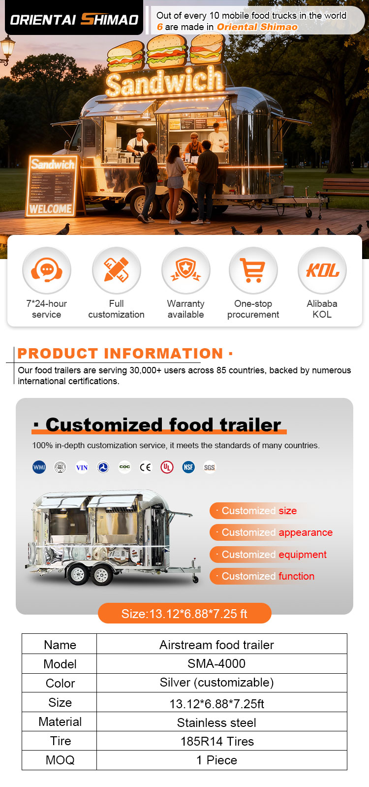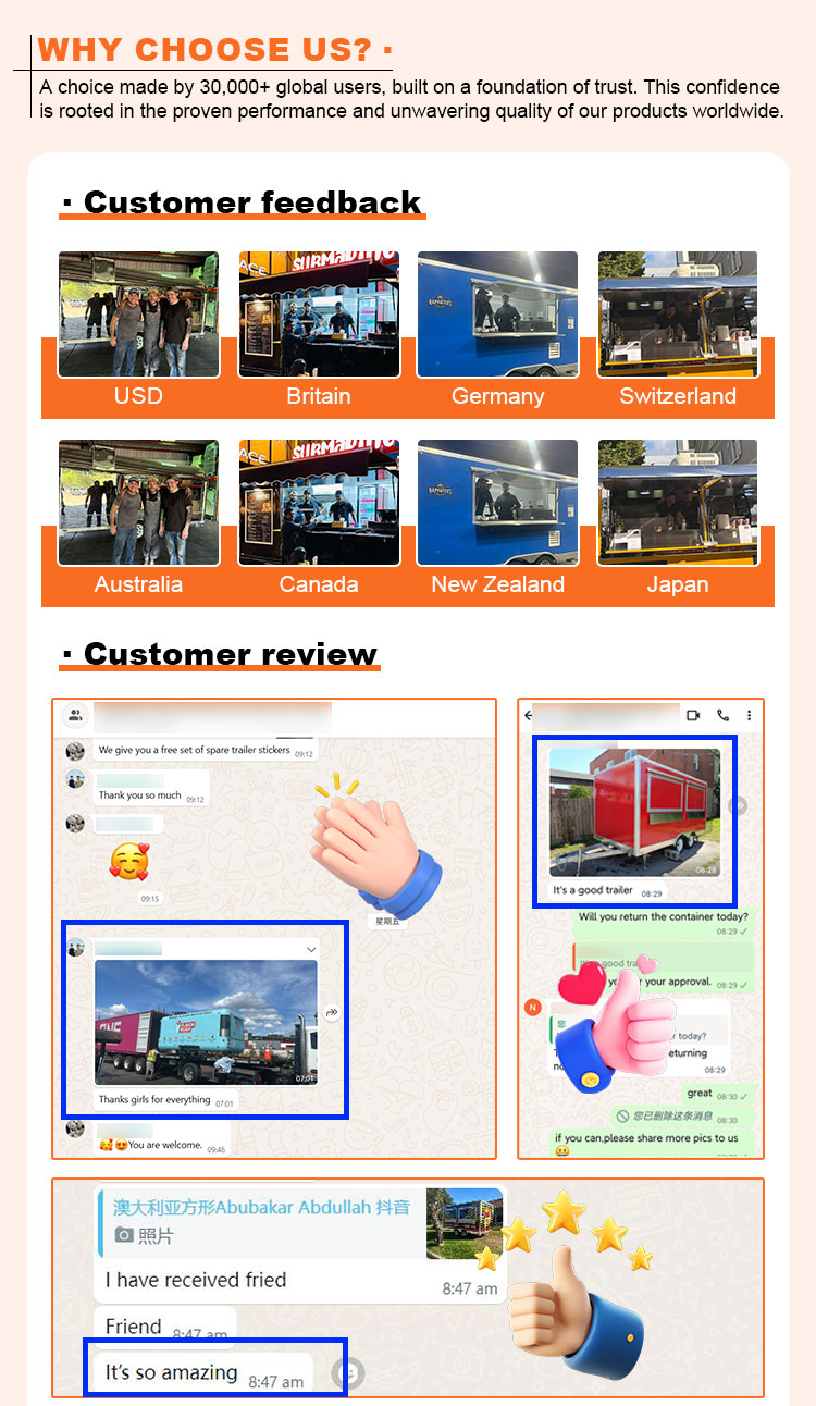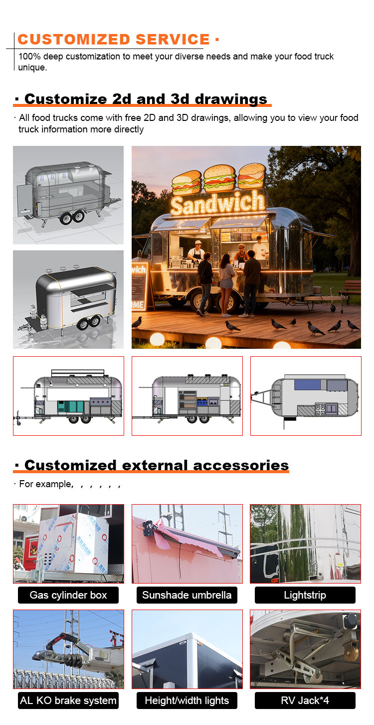 প্রধান উপাদানের জন্য, আমরা উচ্চ-মানের 304 স্টেইনলেস স্টীল বেছে নিয়েছি, যা তার চমৎকার জারা প্রতিরোধের এবং চমৎকার স্থায়িত্বের জন্য পরিচিত, এবং বিভিন্ন পরিবেশগত পরিস্থিতিতে স্থিতিশীল কর্মক্ষমতা বজায় রাখতে পারে, এটি নিশ্চিত করে যে আমাদের ট্রেলার ফুড ট্রাক পণ্যগুলি দীর্ঘমেয়াদেও তাদের চমৎকার গুণমান এবং কার্যকারিতা বজায় রাখতে পারে এবং বিভিন্ন ধরনের চ্যালেঞ্জের মুখোমুখি হতে পারে। 304 স্টেইনলেস স্টিলের জারা প্রতিরোধের দুর্দান্ত প্রতিরোধ, যাতে ট্রাকটি অক্সিডেশন বা মরিচা দ্বারা প্রভাবিত হওয়া সহজ নয়, যা এর পরিষেবা জীবনকে ব্যাপকভাবে প্রসারিত করে। 304 স্টেইনলেস স্টিলের চমৎকার জারা প্রতিরোধ ক্ষমতা ট্রাকটিকে অক্সিডেশন বা মরিচারের জন্য কম সংবেদনশীল করে তোলে, তাদের পরিষেবা জীবনকে ব্যাপকভাবে প্রসারিত করে।