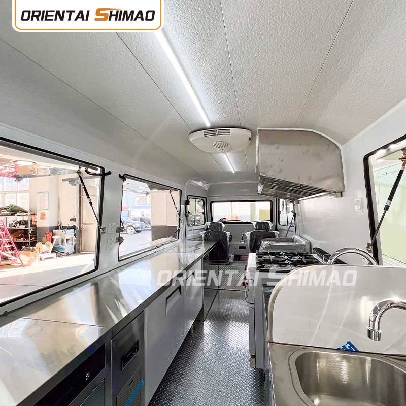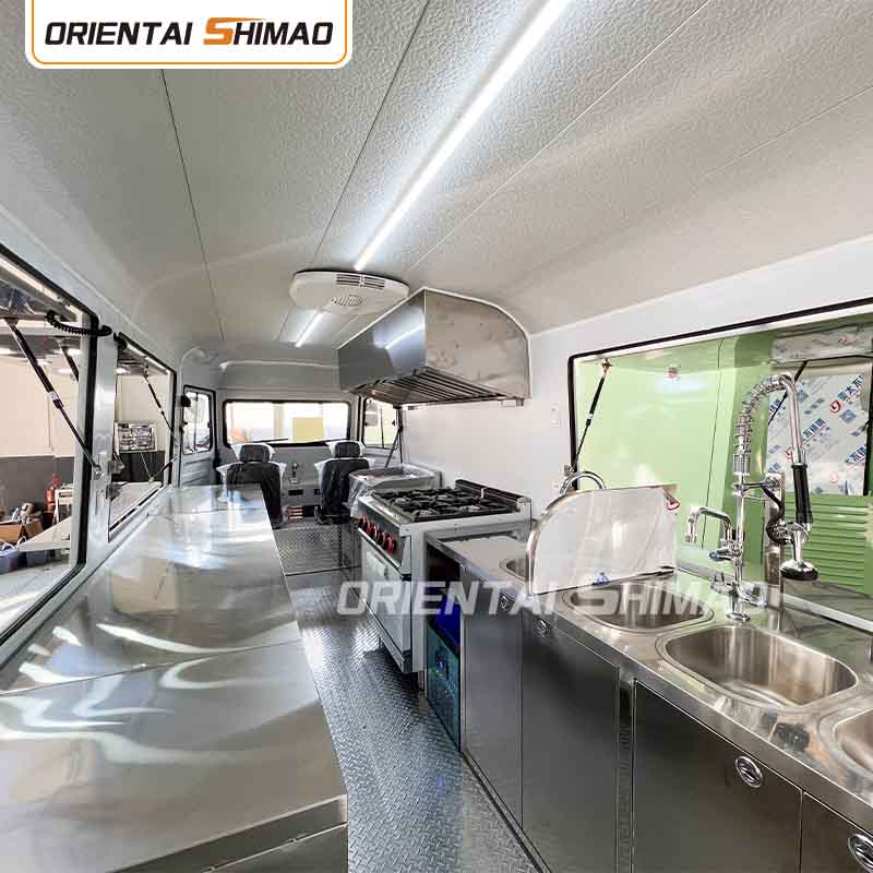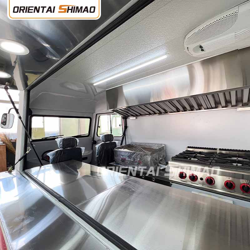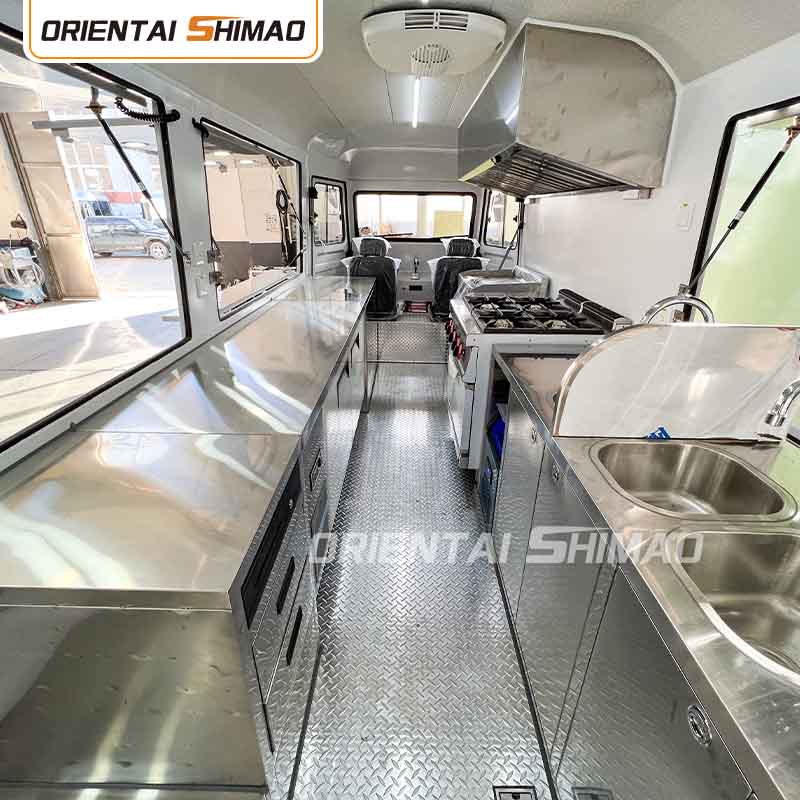 স্টেইনলেস স্টিলের অভ্যন্তর: অভ্যন্তরটি স্টেইনলেস স্টিল দিয়ে তৈরি, একটি শক্তিশালী এবং টেকসই অভ্যন্তর নিশ্চিত করে যা পরিষ্কার করা এবং বজায় রাখা সহজ এবং খাদ্য স্বাস্থ্যবিধি মান পূরণ করে। স্টেইনলেস স্টিলের ব্যবহার শুধুমাত্র খাদ্য ট্রাকের পরিষেবা জীবনকে উন্নত করে না, তবে খাদ্য তৈরির প্রক্রিয়ার স্বাস্থ্যবিধি এবং নিরাপত্তা নিশ্চিত করে।