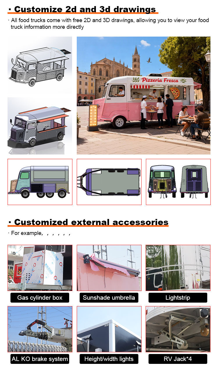 মডেলিং এবং শৈলী: খাদ্য ট্রাকের চেহারা মডেলিং এবং শৈলী গ্রাহকদের আকৃষ্ট করার জন্য একটি গুরুত্বপূর্ণ কারণ। এটি গ্রাহকদের ব্র্যান্ড ইমেজ, ব্যবসার বৈশিষ্ট্য বা ব্যক্তিগত পছন্দ অনুযায়ী কাস্টমাইজ করা যেতে পারে, যেমন সুবিন্যস্ত নকশা, বিপরীতমুখী শৈলী, আধুনিক সরলতা এবং তাই।
