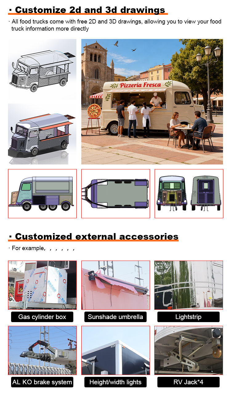 মডেলিং এবং শৈলী: খাদ্য ট্রাকের চেহারা মডেলিং এবং শৈলী গ্রাহকদের আকৃষ্ট করার জন্য একটি গুরুত্বপূর্ণ কারণ। এটি গ্রাহকদের ব্র্যান্ড ইমেজ, ব্যবসার বৈশিষ্ট্য বা ব্যক্তিগত পছন্দ অনুযায়ী কাস্টমাইজ করা যেতে পারে, যেমন সুবিন্যস্ত নকশা, বিপরীতমুখী শৈলী, আধুনিক সরলতা এবং তাই।